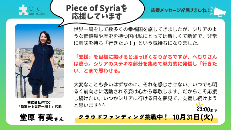 【応援メッセージ】株式会社WTOC 「教室から世界一周!」代表 堂原有美さん