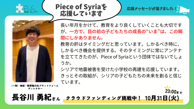 きっとその取組が、シリアの子どもたちの未来を創ると信じています。