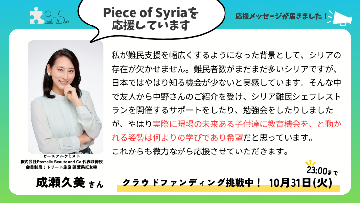 成瀬さんとは「難民支援の活動をする仲間のシリアの勉強会に参加してくれないか」という友人の紹介でつながりました。