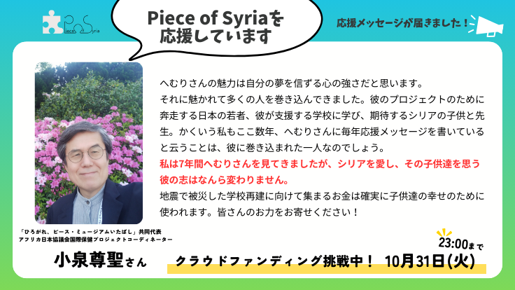 【応援メッセージ】ひろがれ、ピース・ミュージアムいたばし 共同代表 小泉尊聖さん