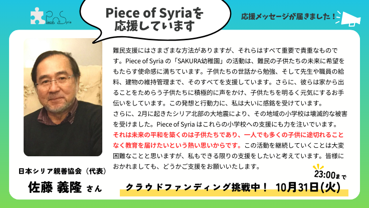 【応援メッセージ】日本シリア親善協会(代表)佐藤義隆さん