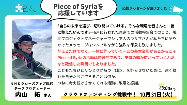 内山さんの応援を力に、より良い活動をシリアの人たちと共に作っていきますね!