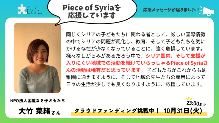 共にシリアの人達のために、想いを込めて活動する仲間の大竹さんからの応援のメッセージ、