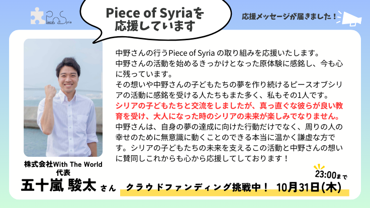 中野さんの行うPiece of Syria の取り組みを応援いたします。