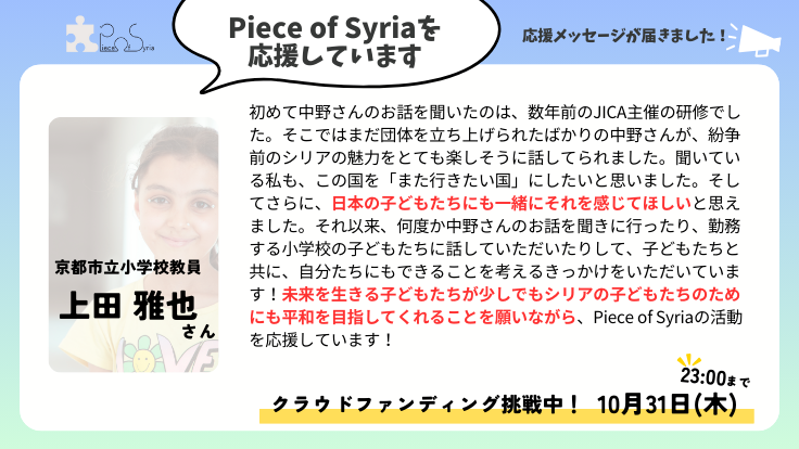 未来を生きる子どもたちが少しでもシリアの子どもたちのためにも平和を目指してくれることを願いながら、Piece of Syriaの活動を応援しています!