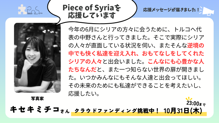 <応援メッセージ>キセキ ミチコさん(写真家)