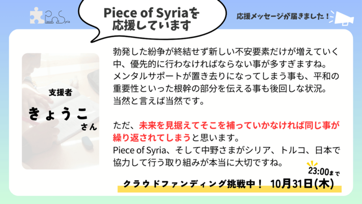 Piece of Syria、そして中野さまがシリア、トルコ、日本で協力して行う取り組みが本当に大切ですね。