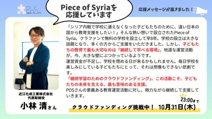 <応援メッセージ>小林 清さん(近江化成工業株式会社 代表取締役)
