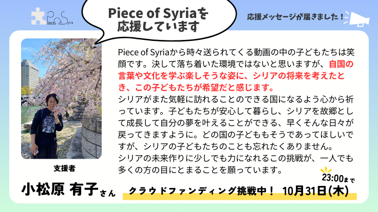 小松原さんは、Piece of Syriaの立ち上げ当初からずっと応援をいただいています!