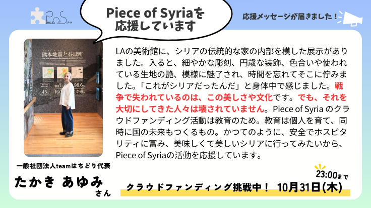 たかきさんは、昨年、Piece of Syriaのクラウドファンディングを応援するために、イベント【Piece of Syriaの中野貴行さんに聞く 「子どもとどう平和を語ったらいいですか?」】を企画していただき、親子で平和について考える機会を作っていただきました。