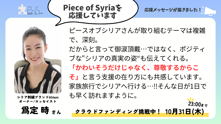 <応援メッセージ>爲定 時さん(シリア刺繍ブランドAhlamオーナー/エッセイスト)