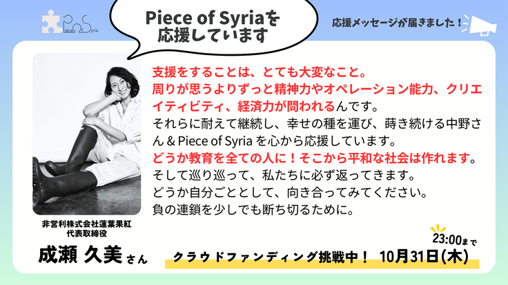 <応援メッセージ>成瀬 久美さん(非営利株式会社蓮葉果紅 代表取締役)
