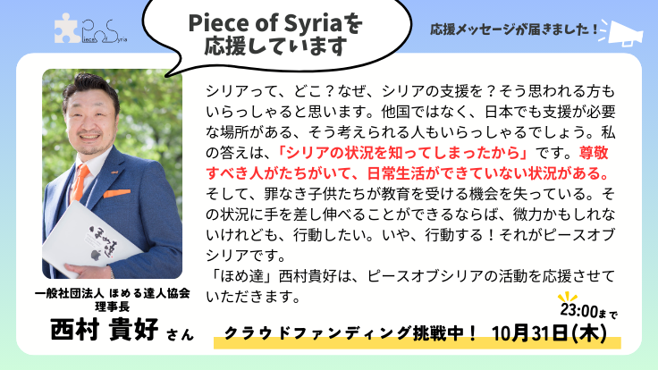 「ほめ達」西村貴好は、ピースオブシリアの活動を応援させていただきます。