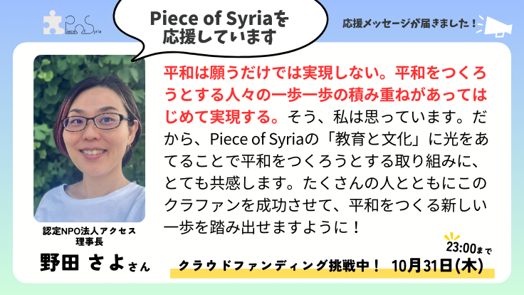 <応援メッセージ>野田さよさん(認定NPO法人アクセス 理事長)