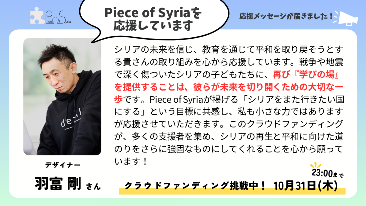 このクラウドファンディングが、多くの支援者を集め、シリアの再生と平和に向けた道のりをさらに強固なものにしてくれることを心から願っています!