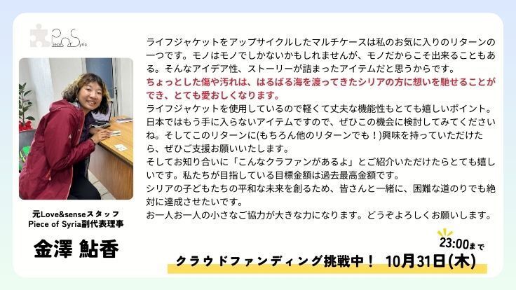 元Love&senseスタッフの金澤鮎香さんから、商品への想いとクラファンに対するメッセージをいただきましたので、最後にご紹介させていただきます。
