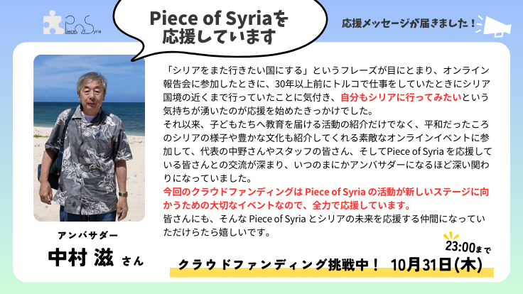 今回のクラウドファンディングは Piece of Syria の活動が新しいステージに向かうための大切なイベントなので、全力で応援しています。