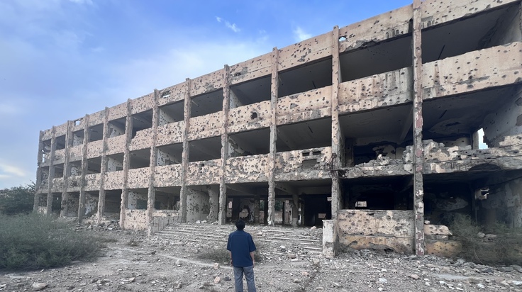 戦争の生々しい銃弾の跡が残る学校の校舎(2025年4月)
