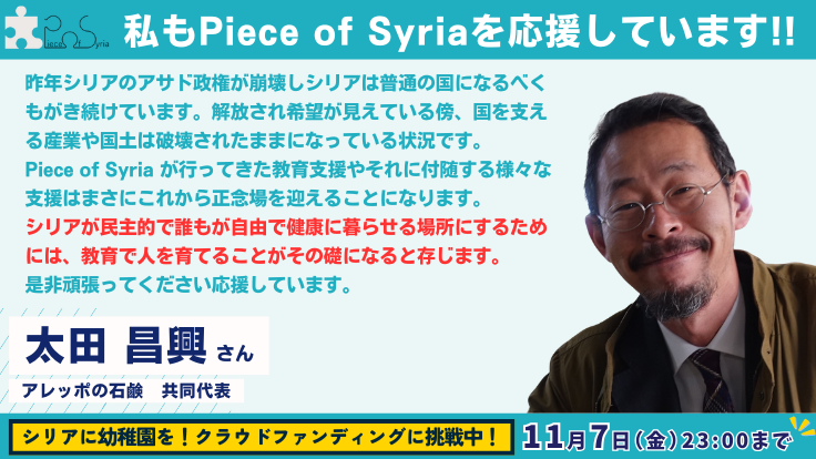アレッポの石鹸 共同代表・太田 昌興さんから応援のメッセージが届きました!!