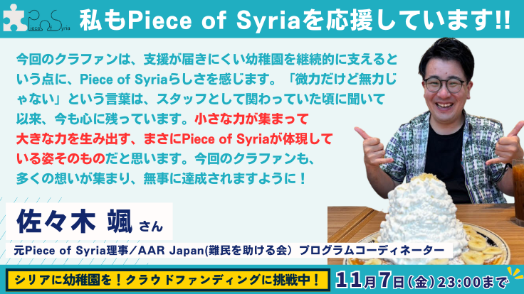 元Piece of Syria理事/AAR Japan(難民を助ける会)プログラムコーディネーター・佐々木 颯さんから応援のメッセージが届きました!!