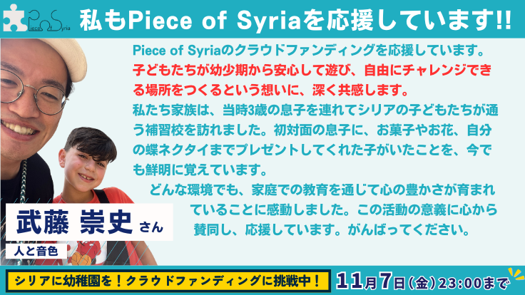 ご家族でトルコに来てくださり、お子さんがシリアの子どもたちとすぐに打ち解け、笑顔で遊んでいた光景が今も忘れられません。