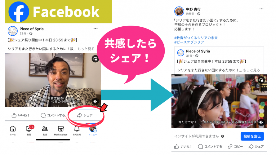 11/4(火)の夜は「シェア祭り」で応援を!あなたの<1シェア>が、シリアの子どもたちの未来を創る!