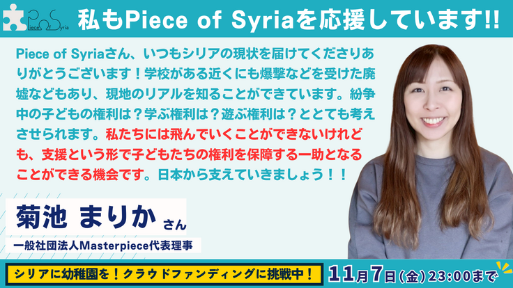 一般社団法人Masterpiece 代表理事・菊池まりかさんから応援のメッセージが届きました!!