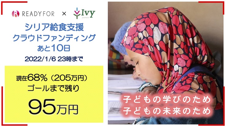 厳しい環境にあるシリアの子どもたちに給食を届け、彼らの学びの場をつくり、ひいては未来をつくるため、どうか最後までお力添えいただけますようお願い申し上げます!