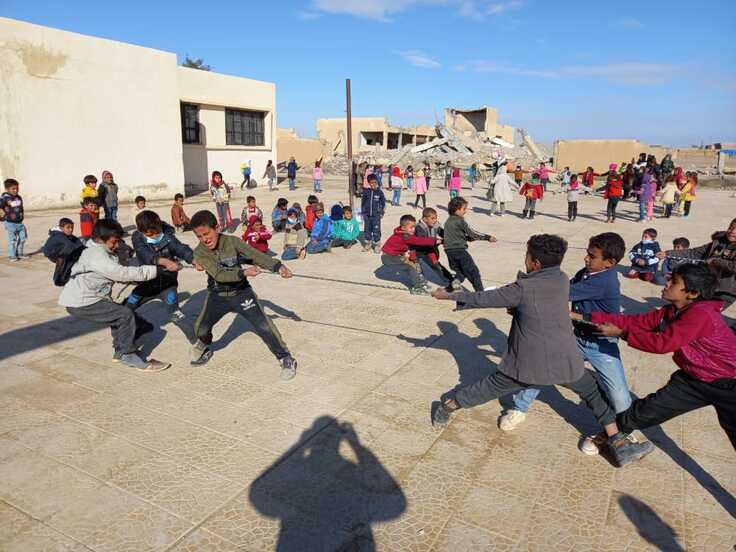 心理社会的支援の活動の一つ。この日は綱引きなどで体を動かして心身をリフレッシュさせていました。