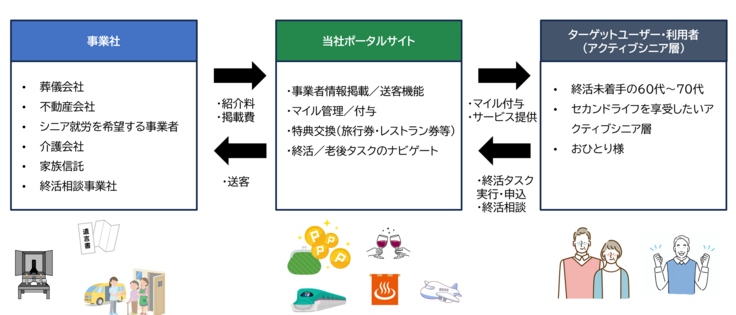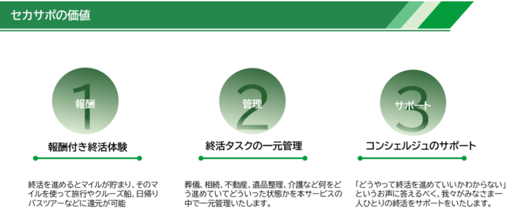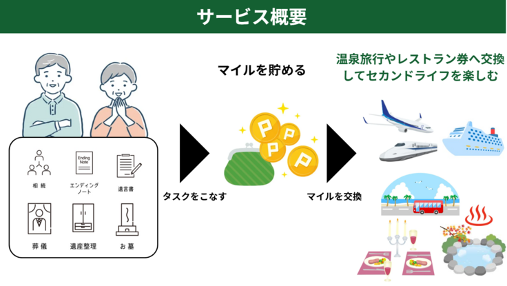 私たちは「終活=”義務感/家族に迷惑をかけない」という既定概念を「終活=ご自身がセカンドライフを楽しむ準備」に変えるため、終活のタスクを進めるたびにマイルが貯まり、温泉旅行やクルーズ船、レストランなどの体験に交換できる“報酬付き終活サービス”を立ち上げます。(サービス名を仮称として”セカサポ”としています)