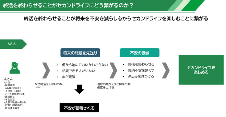 ▼終活を”楽しみ”・”将来のご褒美”へ変えてセカンドライフを楽しむ状態を作り出すことが本サービスの存在意義