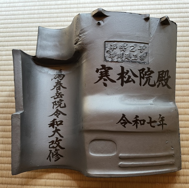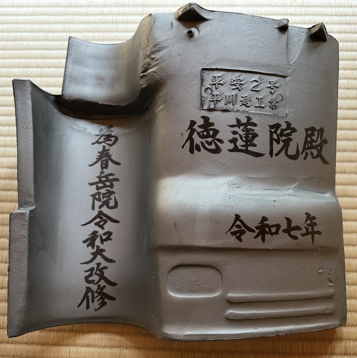 新たに葺き替える本堂屋根の瓦をご奉納いただきます。瓦裏面にご希望のお名前と「一願成就」を春岳院が書き入れさせていただきます。