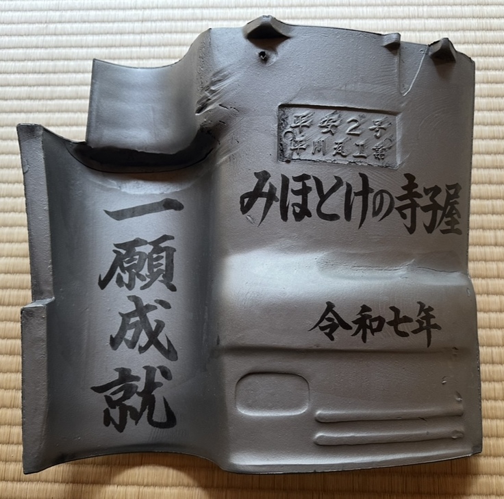 新たに葺き替える本堂屋根の瓦をご奉納いただきます。瓦裏面にご希望のお名前と「一願成就」を春岳院が書き入れさせていただきます。