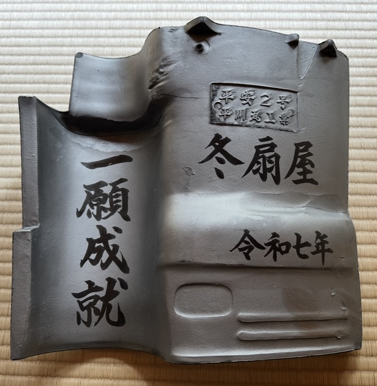 新たに葺き替える本堂屋根の瓦をご奉納いただきます。瓦裏面にご希望のお名前と「一願成就」を春岳院が書き入れさせていただきます。