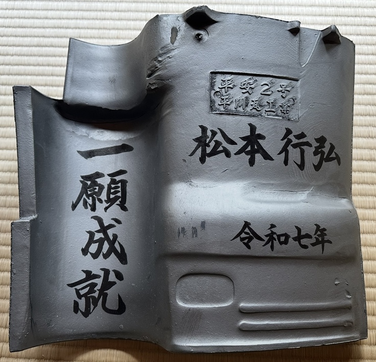 新たに葺き替える本堂屋根の瓦をご奉納いただきます。瓦裏面にご希望のお名前と「一願成就」を春岳院が書き入れさせていただきます。