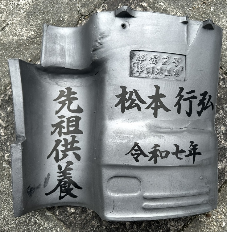 新たに葺き替える本堂屋根の瓦をご奉納いただきます。瓦裏面にご希望のお名前と「一願成就」を春岳院が書き入れさせていただきます。