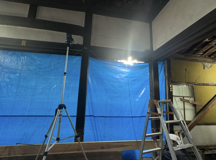 まずはグリーンレーザー墨出し器(画像真ん中より少し左側の三脚の長い銀色の棒の上の機械です)で本堂の水平を出していきます