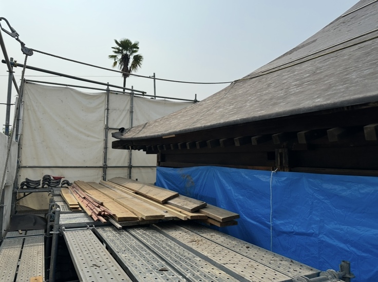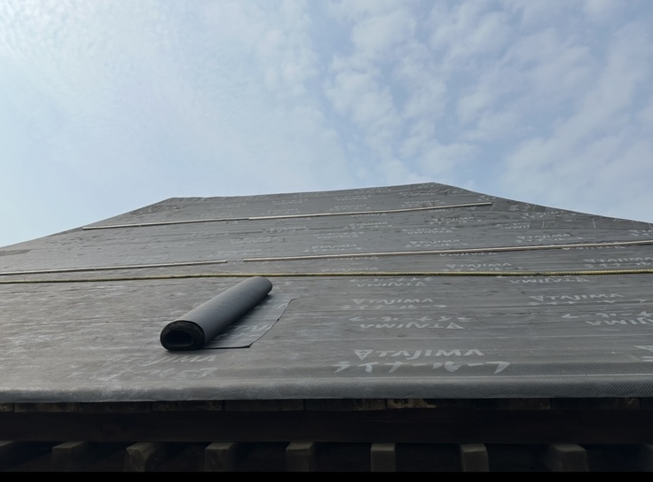 本堂の屋根全面にルーフィング(防水紙・下葺き材)が貼られました