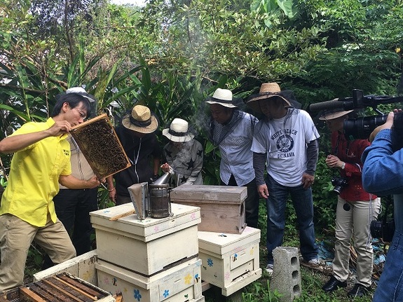 11月12、18日は地元首里の事業者さんたちをお招きして、採蜜体験会を開催しました。皆さん興味津々で質問もたくさん飛び出しました。
