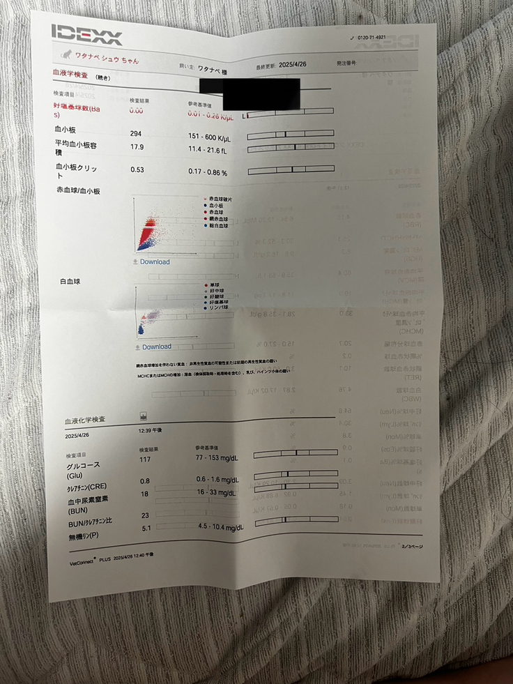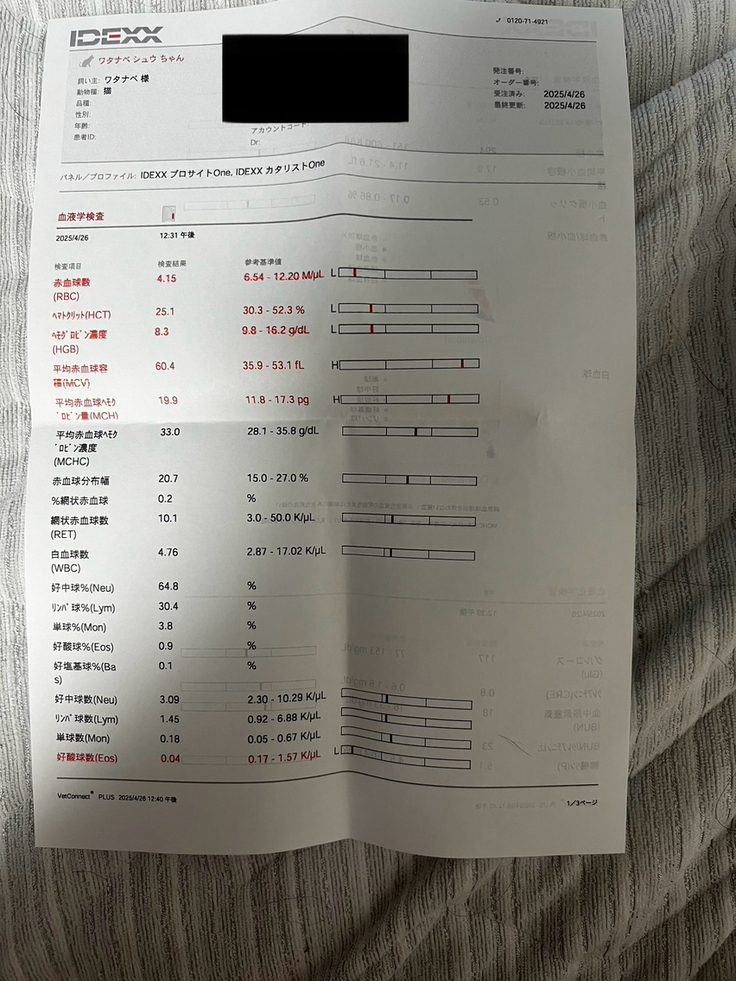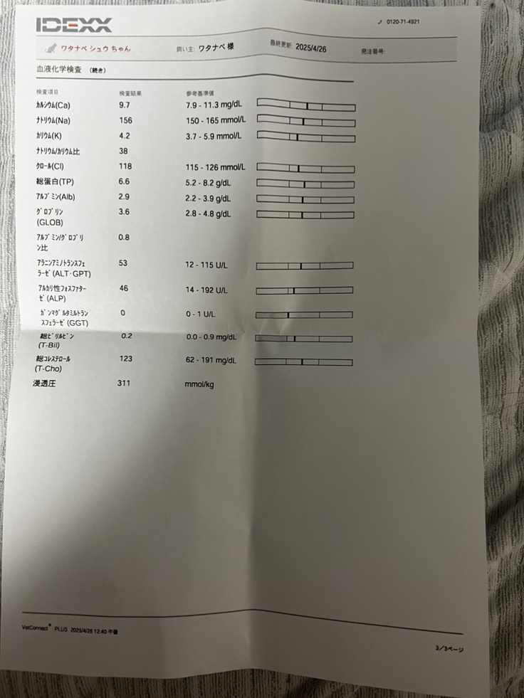 FIPの方は5/1で84日の投薬が終わりますので外部にも血液検査を出しているのでその結果待ちになります。