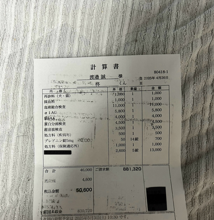今回の治療費です。家に残っているお薬を5/1までで調整しました。請求額については分割対応して頂いているので5月以降からの支払いとなります。