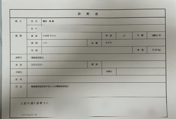 7月10日の手術日までは定期的にコルセットを巻いて経過観察をします。 資金は全て手術、入院、検査費などに使用させていただきます。