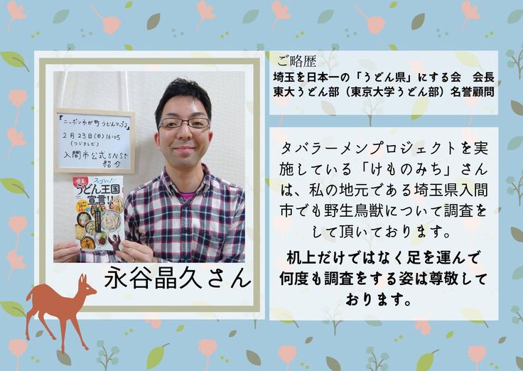 タバラーメンプロジェクトを実施している「けものみち」さんは、私の地元である埼玉県入間市でも野生鳥獣について調査をして頂いております。