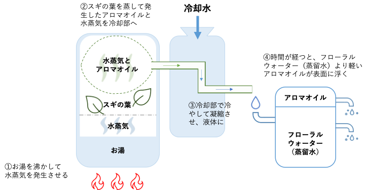 このプロジェクトでは、信濃町森林療法研究会のみなさんにお力をお借りして、「水蒸気蒸留法」でアロマオイルを抽出していただきました(図参照)。葉の収集から蒸留まで、ゆっくりと時間をかけて丁寧に行っていただいています。