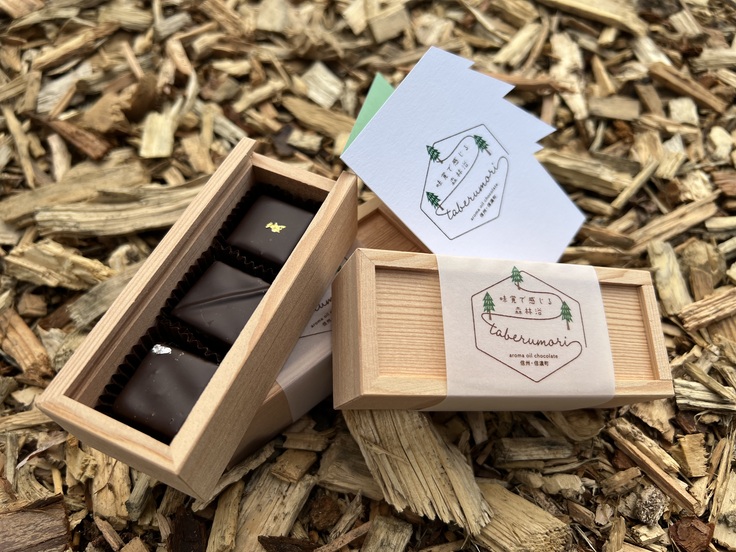 そして、このクマスギのアロマオイルを新しい形で気軽に楽しんでもらうために、長野県佐久市にあるケーキブティックPETERSのオーナーシェフ中村様に相談し、アロマオイルチョコレートの試作を重ね、新しいチョコレートを開発していただきました。