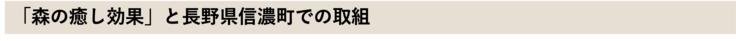 長野県信濃町には、森林再生や森林セラピーの先駆者として活躍されていた故C.W.ニコル氏が作られた「アファンの森」があり、全国の中でも先進的に「森の癒し効果」を活用して、働く方々や子ども、地域住民の“癒しの場”となる「癒しのまちづくり」を進めてきました。
