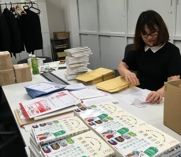 私の横では、山田さんが、書籍の取材や掲載でお世話になった先へ、見本誌の送付の準備。