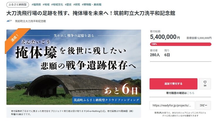 10月6日(金)からスタートしましたクラウドファンディング第二弾(掩体壕保存)において、最終日まで残り8日となる11月22日(水)に目標金額500万円を達成することができました。全国から、たくさんの方々に関心を寄せていただき、温かいご寄附をいただきましたこと、スタッフ一同心より感謝申し上げます。