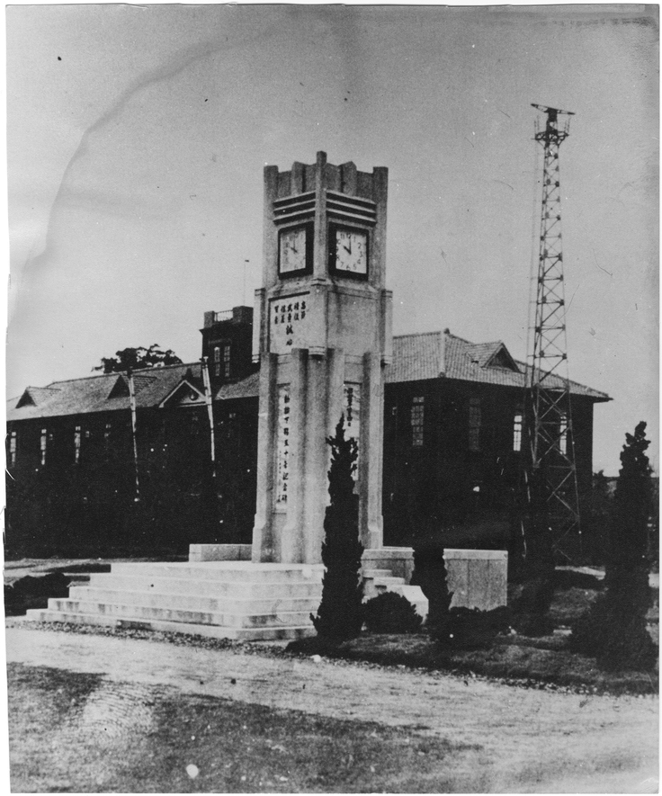 当館から約500m。写真(上)は、現在の慰霊碑(時計台)、写真(下)は戦時中のものです。