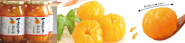 マー 丸みかんの瓶詰め自体はね、ホンマは破棄するみかんのサイズやったんよ。おばちゃんらが冬に売り物にならんアカンみかんを瓶詰やって夏に食べるとかやってたんよ。普通は大きいみかんを一袋ずつバラバラにしてやるんやけど、小さいサイズのみかんも美味いからってバラバラにするん面倒くさいから、大きい瓶へ入れてた。バラバラのもんも小さい玉のまんまのも入れておばちゃんらが自分らの趣味で作ってた。冬に市場の人と売り終わった後の反省会で「こんなん作ってんのよ」って見せたら「これ商品になるぞ」って(笑)。まあ言うたら「B品」というか加工にまわってしまうもんも喜ばれる商品に変わるというか(『てまりみかん』)。